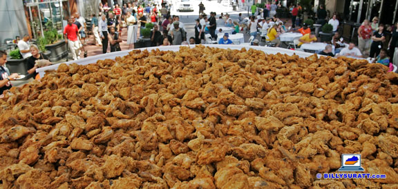 KFC marked the 70th anniversary of founder Kentucky Colonel Harland Sanders’ proprietary secret “Original Recipe” of 11 herbs and spices by attempting to set a new world record for largest single serving of fried chicken on Tuesday, Aug. 17, 2010 at Fourth Street Live! in Louisville, Ky. A KFC spokesman said more than 2,400 pounds of chicken were served, shattering the as-yet uncertified previous record of 1,654 pounds set by an Indiana festival in July. (Photo by Billy Suratt)